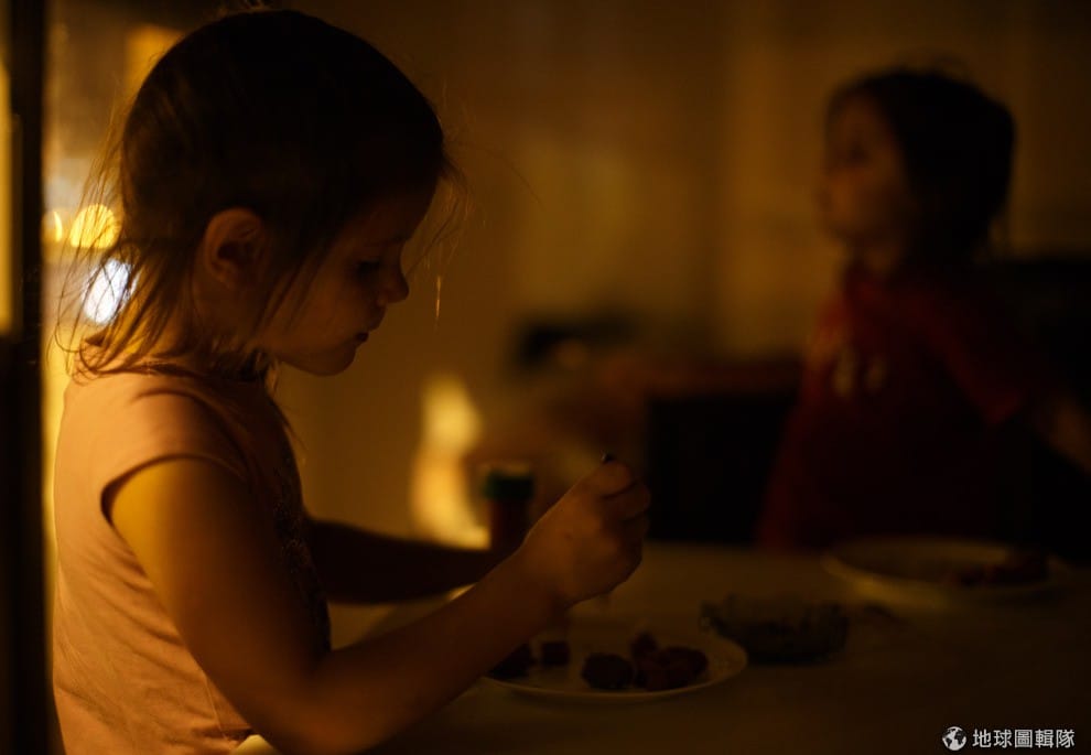 照片中是5歲的克奧瑪拉,她跟家人一起就著微弱的路燈吃飯。