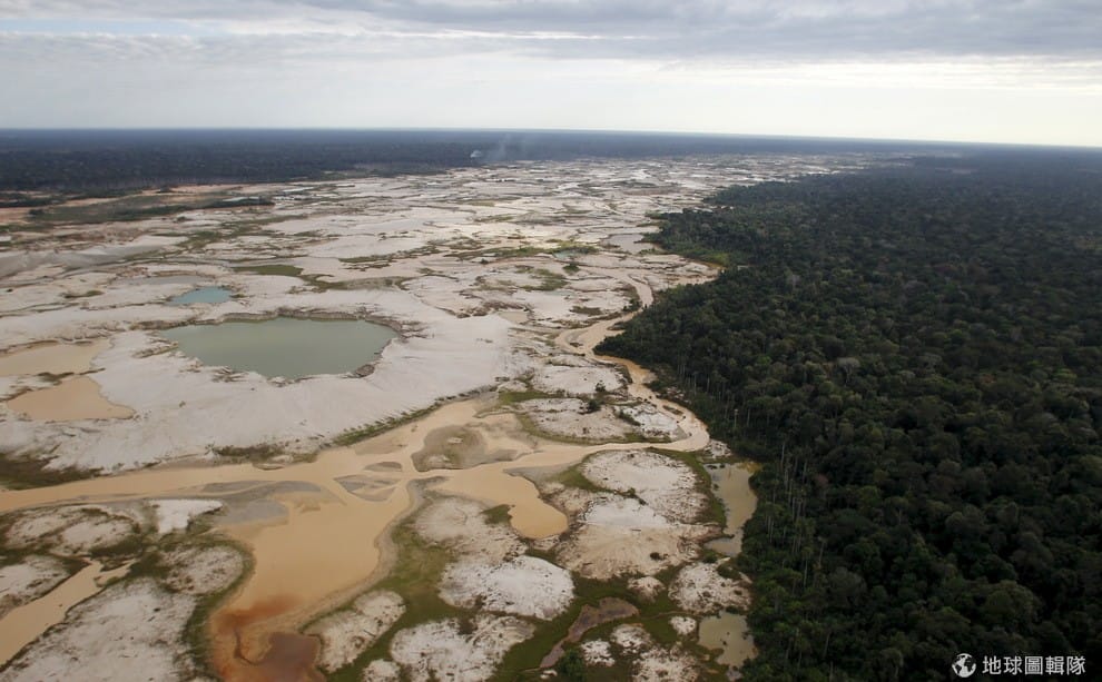 圖片左方是為了非法採礦而被夷平的雨林。2001年到 2013年之間,大約有 16萬8,000公頃(近一半的台灣大小)的森林被非法採礦業者夷平,其中蓋亞那、秘魯、巴西、哥倫比亞地區的雨林消失情況最為顯著。