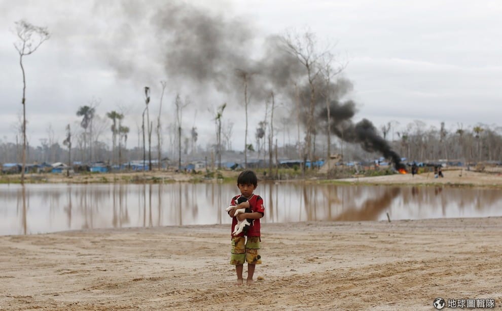 一名小孩站在被摧毀的非法金礦前方。非法金礦的情形雖然在非洲也有,但是拉丁美洲的狀況更為糟糕。