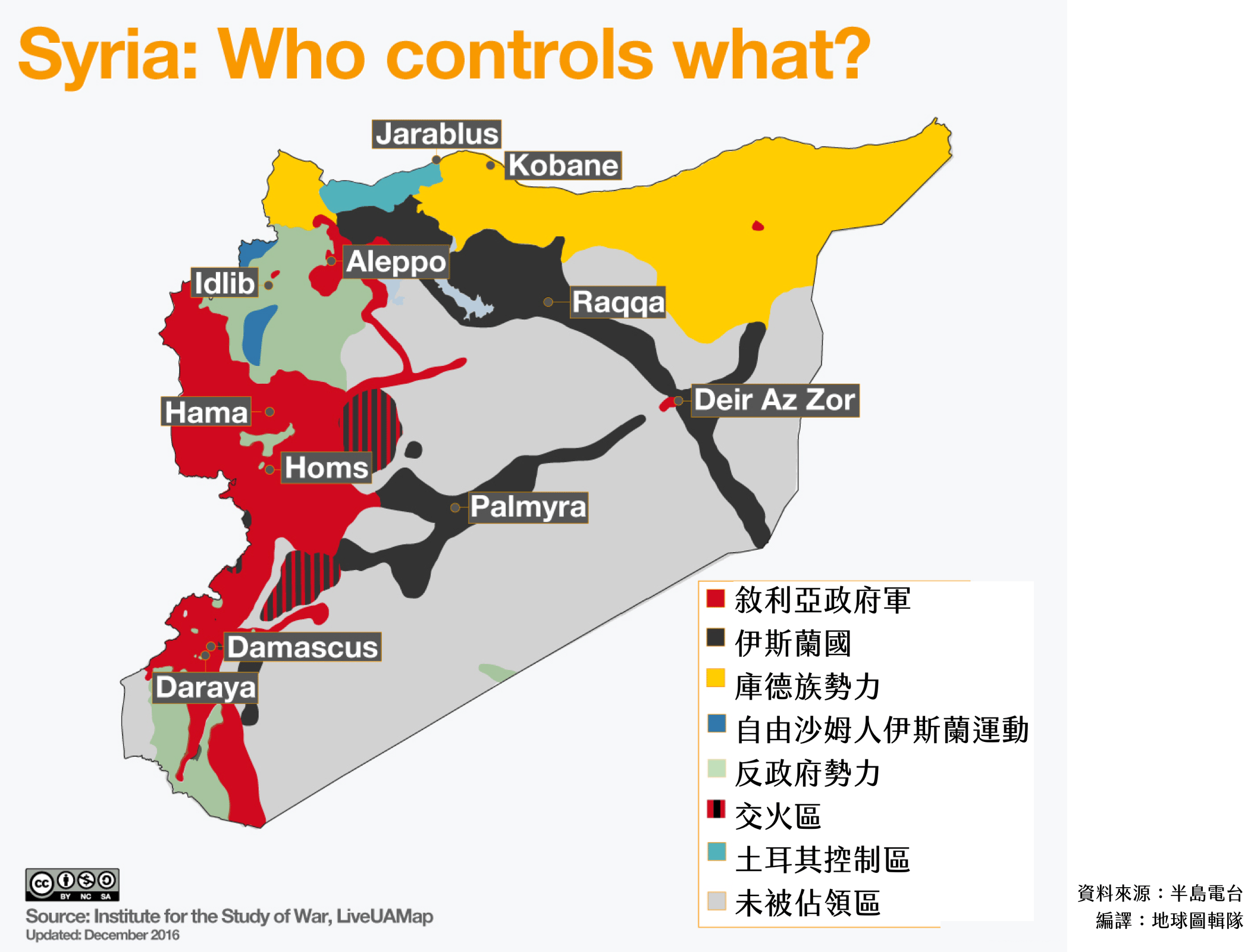 圖為在敘利亞內,不同勢力在各地區的分布圖。