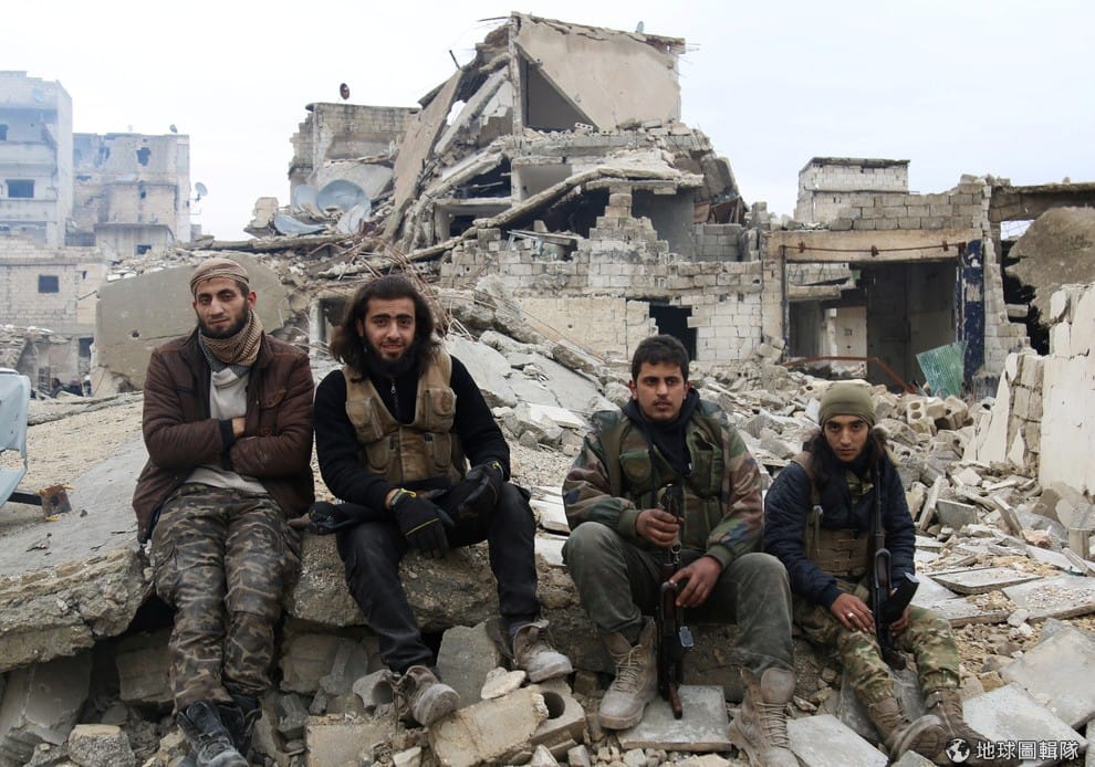 圖拍攝於 18號,反政府軍坐在阿勒坡城的斷垣殘壁上,等著撤退到安全的避難處。現在阿勒坡城已全數回到政府軍手上。