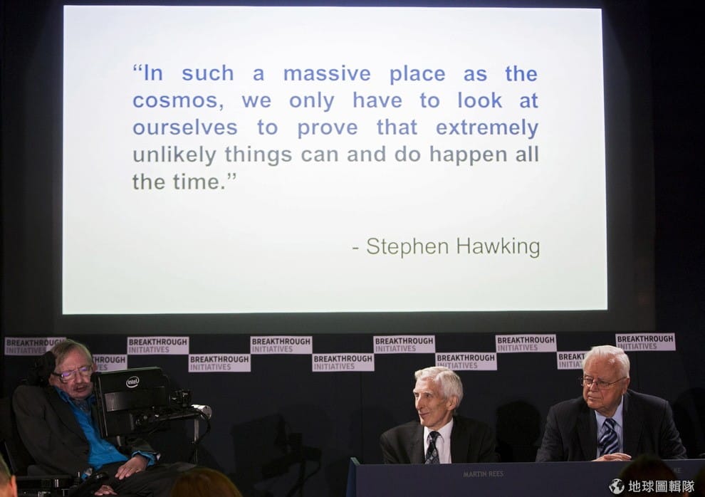 2015年7月,探索外星智慧生命的「突破聆聽」計畫請來全球知名的科學家幫忙,圖左是英國天文物理學家霍金。因為漸凍症導致無法行動的他,正運用語音合成系統向大家宣布這項計畫,銀幕上的字幕寫到:「在浩瀚的宇宙中,我們人類只要看看自己,就知道看似極度不可能的事情其實是做得到且時常在發生。」