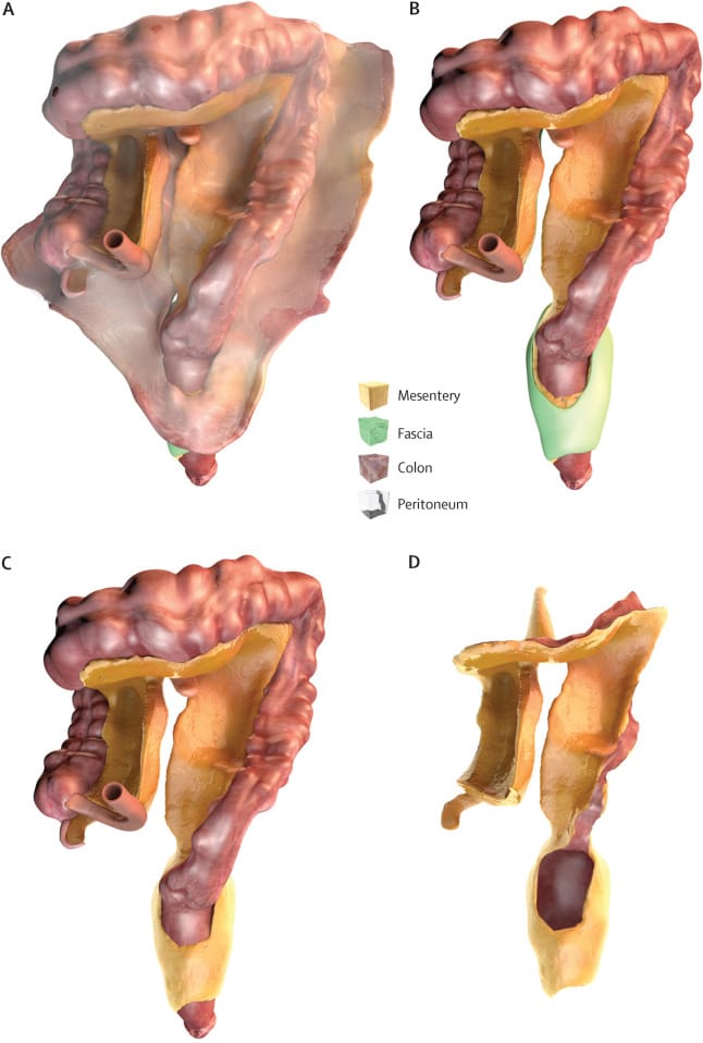 圖為腸繫膜、筋膜(fascia)、結腸(colon)、腹膜(peritoneum)的逐步圖解,右下角的D即為腸繫膜的完整樣貌。