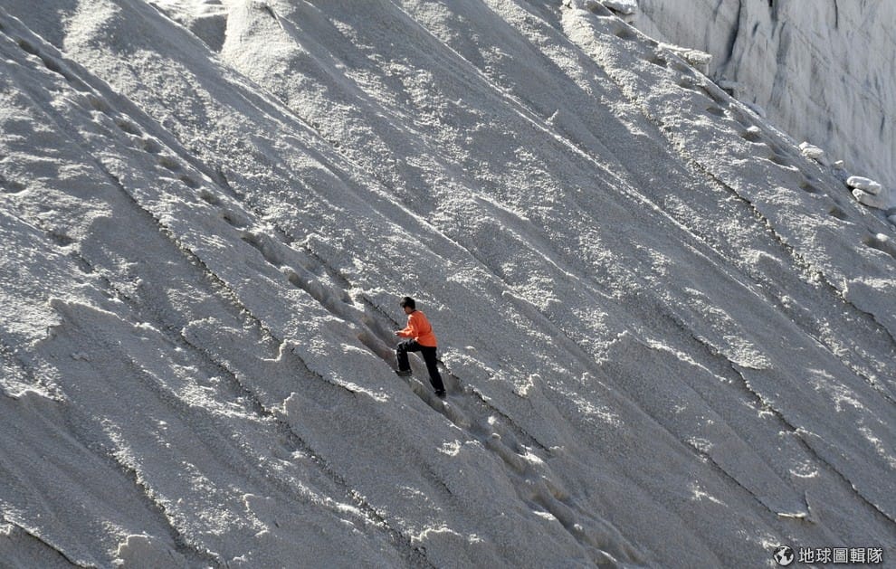 一名男子爬在雪白的鹽山上,這裡是青海省的茶卡鹽湖。隨著當局開放鹽市,未來鹽商可以直接賣鹽給消費者,不須透過國營配銷公司。