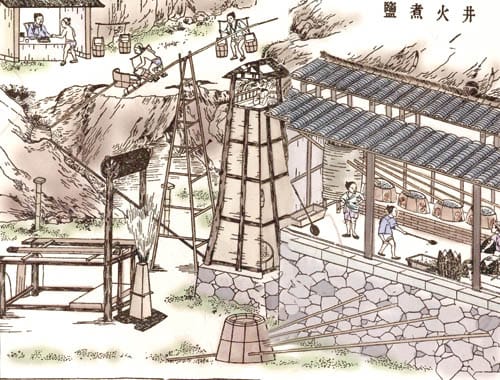 圖為中國明代科學家宋應星所著《天工開物》一書中,所描繪的井火煮鹽一景。