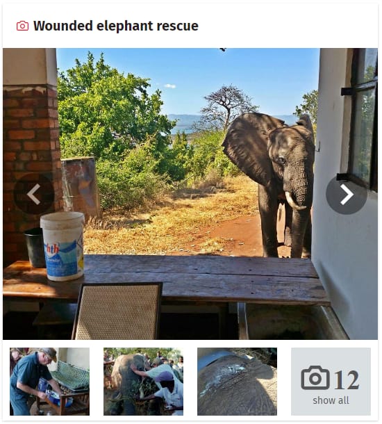 非洲公象多是單獨行動。工作人員和訪客很驚訝的看到一頭嚴重脫水和受傷的公象,跑到他們的窗口,似乎在求救。大象身上有一個腐敗的傷口,和兩個彈孔在牠的耳朵,顯示牠是盗獵者槍下的受害者。取自:Bumi hills foundation