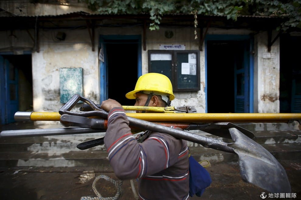 尼泊爾電力局的員工搬運著工作要用的相關器具,尼泊爾長久以來面臨電力短缺的困境。