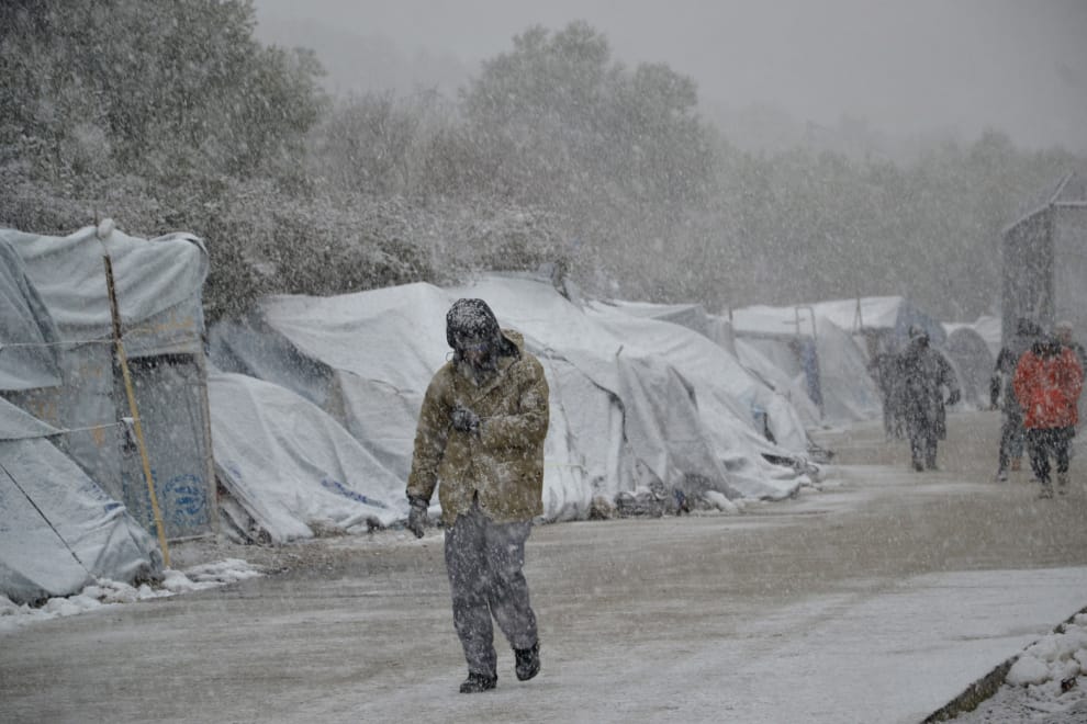 路透社圖片紀錄下在極寒氣候襲來時,希臘難民營不敵風雪的情景。