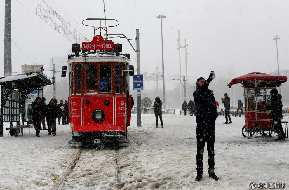 土耳其伊斯坦堡也下起大雪。圖中的男子正在和風雪中的電車自拍。