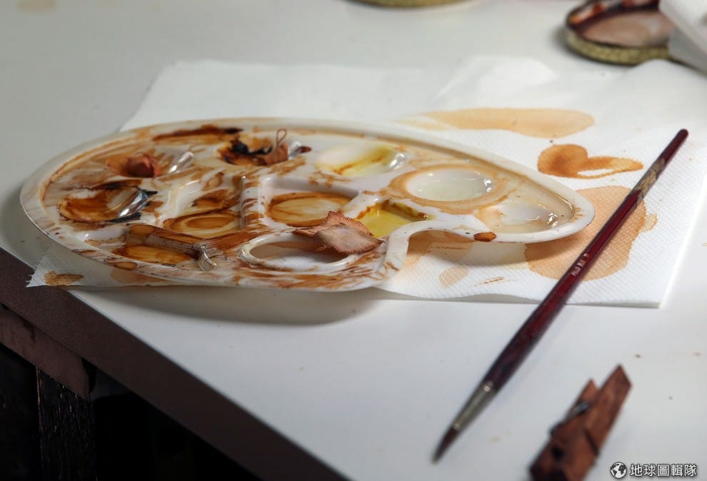 路透社調色盤被隨意擺放在工作室內,上頭的色彩就是繪製小提琴時所需的調色。