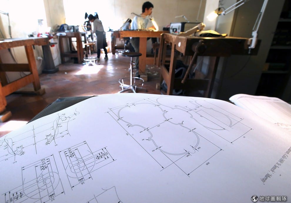 路透社安東尼奧‧史特拉瓦第研究所內,師生們正在確認打磨出的小提琴板比例正確。
