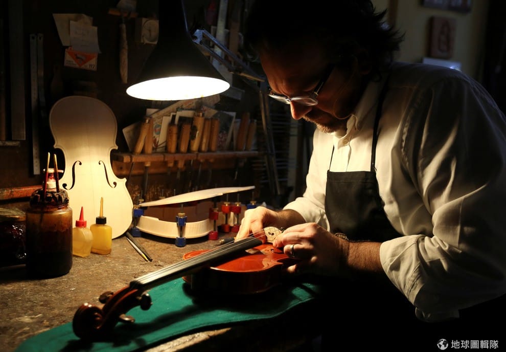 製琴師塔拉布吉(Stefano Trabucchi)正在調整小提琴上的琴馬(又稱琴橋),這是一把製作要價 67萬的大師級小提琴。