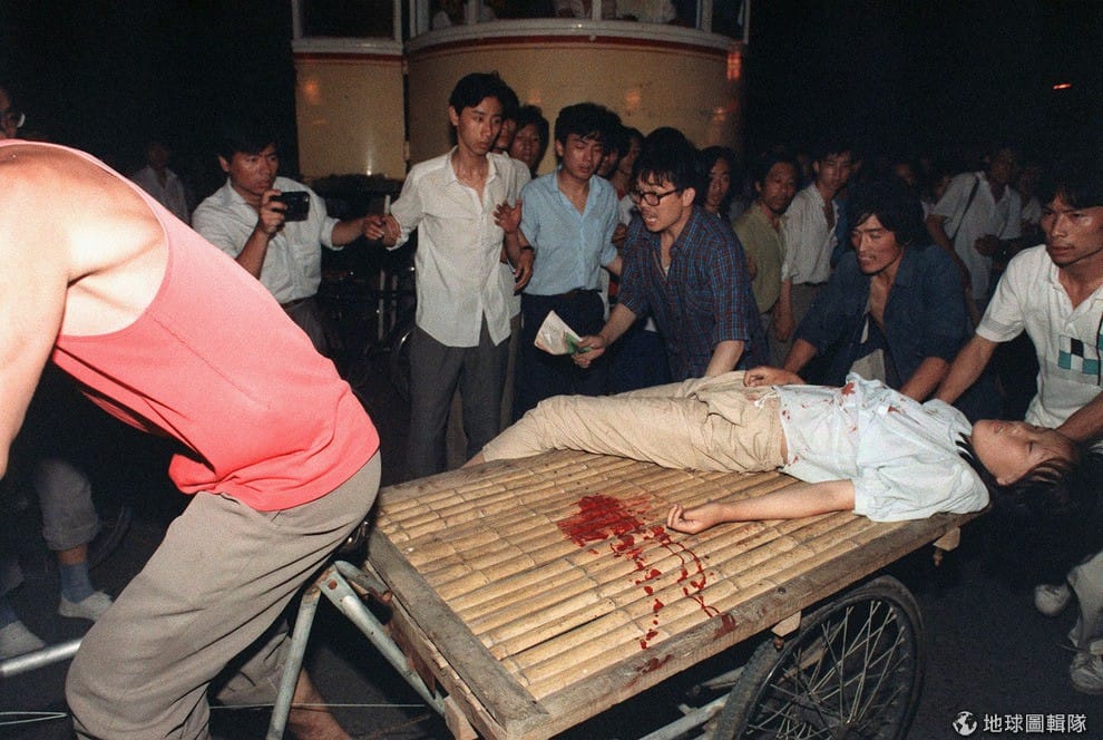 當年不只是中國居民示威遊行,許多外地記者也在訴求民主自由的行列中,照片中就是當年事件發生當晚,有外籍記者在衝突中受傷流血的畫面。