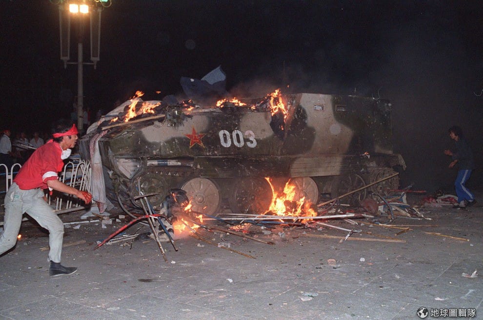 1989年,天安門事件發生的當晚,人民解放軍和民眾發生嚴重的流血衝突,照片中可以見到學生將汽油彈和火炬朝武裝戰車丟擲後,戰車燃起大火。