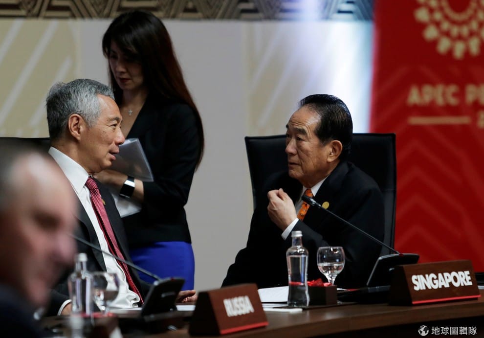 2016年11月,在祕魯召開的亞太經濟合作會議(APEC)上,新加坡總理李顯龍(左)和中華民國代表宋楚瑜(右)交談。