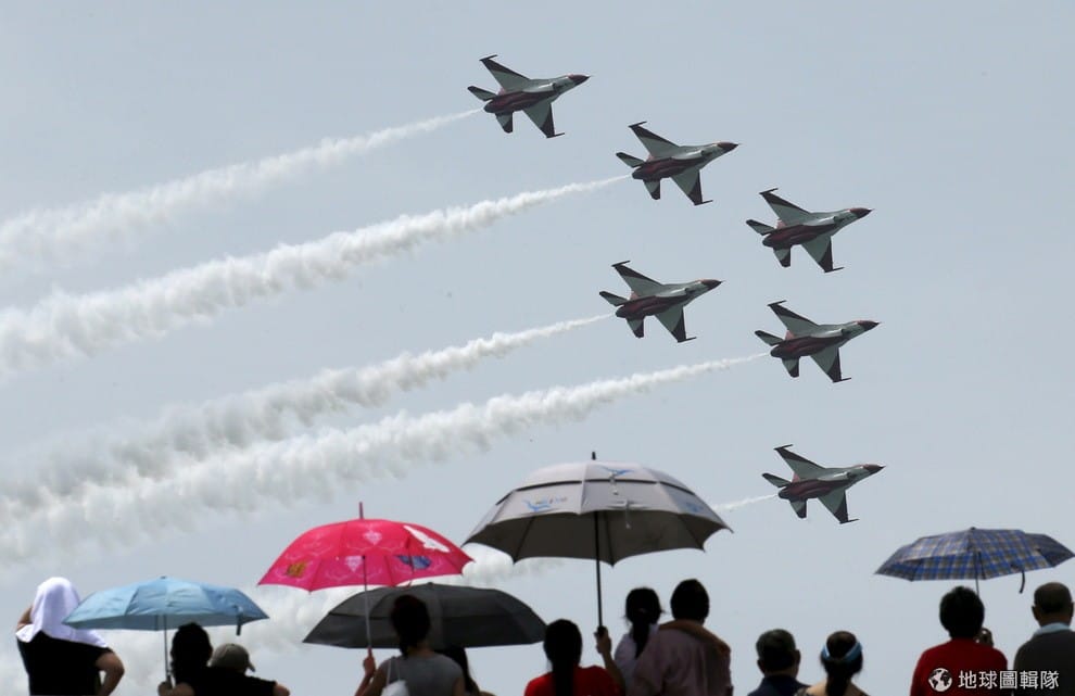 新加坡民眾看著天空上翱翔的新加坡軍機。1975年,新加坡與台灣簽署《星光計畫》,讓新加坡軍隊可以來台灣接受軍事訓練。
