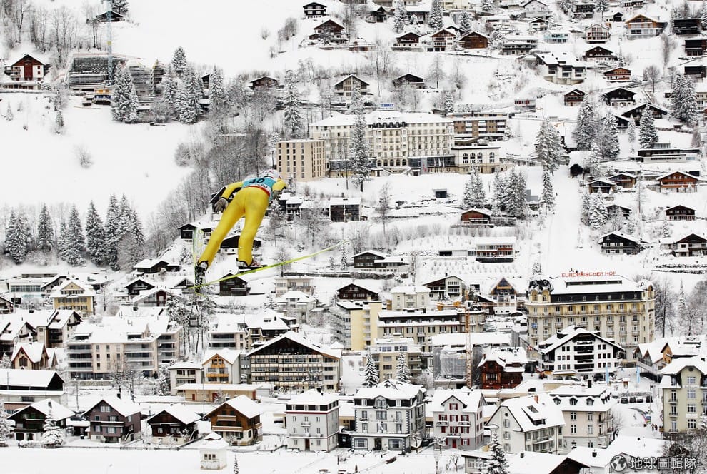 一名滑雪好手在瑞士城市恩格爾貝格(Engelberg)的雪山上縱身一跳。