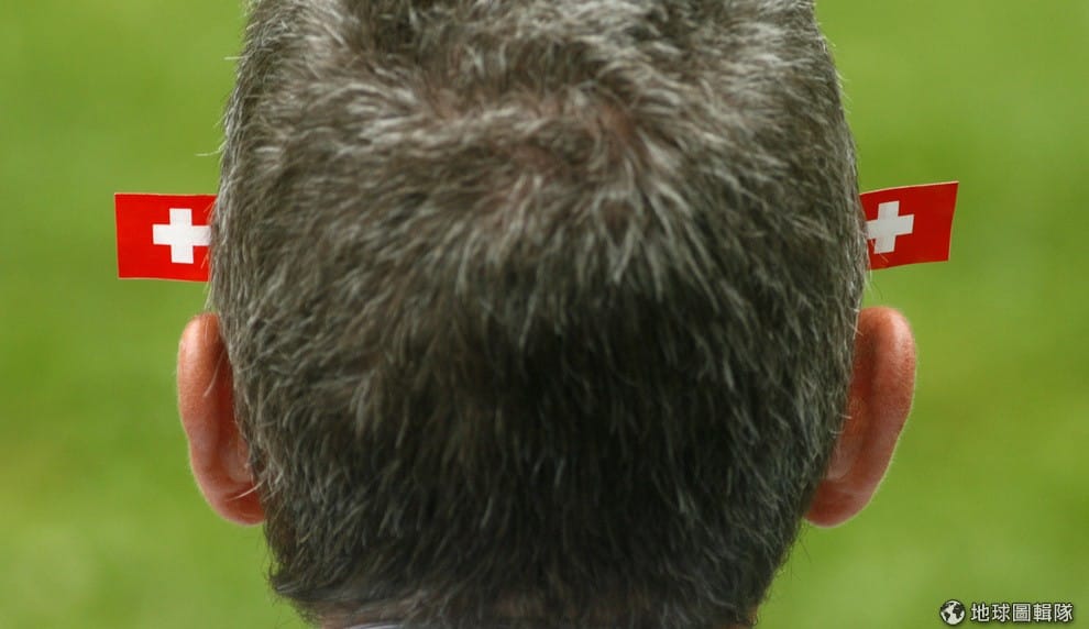 一名男子把瑞士國旗掛在耳朵兩旁。在瑞士,能不能入籍成功是可以由居民共同決定的。