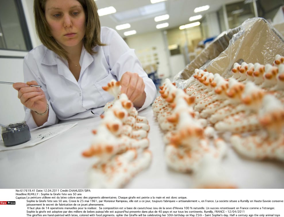 美國小兒牙醫肯妮絲剖開家裡的蘇菲長頸鹿後發現,玩具內部充滿黑色黴菌。圖為製作蘇菲長頸鹿的工廠。