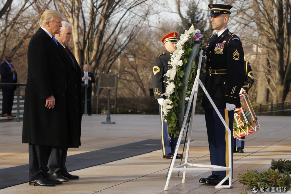 在抵達林肯紀念堂前,美國準總統川普與準副總統彭斯在 19號下午前往阿靈頓國家公墓,為逝世的軍人獻上花圈。
