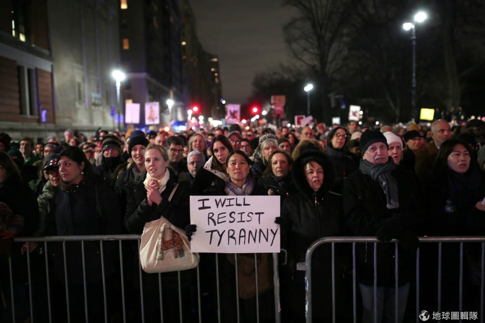 群眾聚集在川普國際酒店大廈外抗議,中間的牌子寫著:「我將會抵制暴君。」