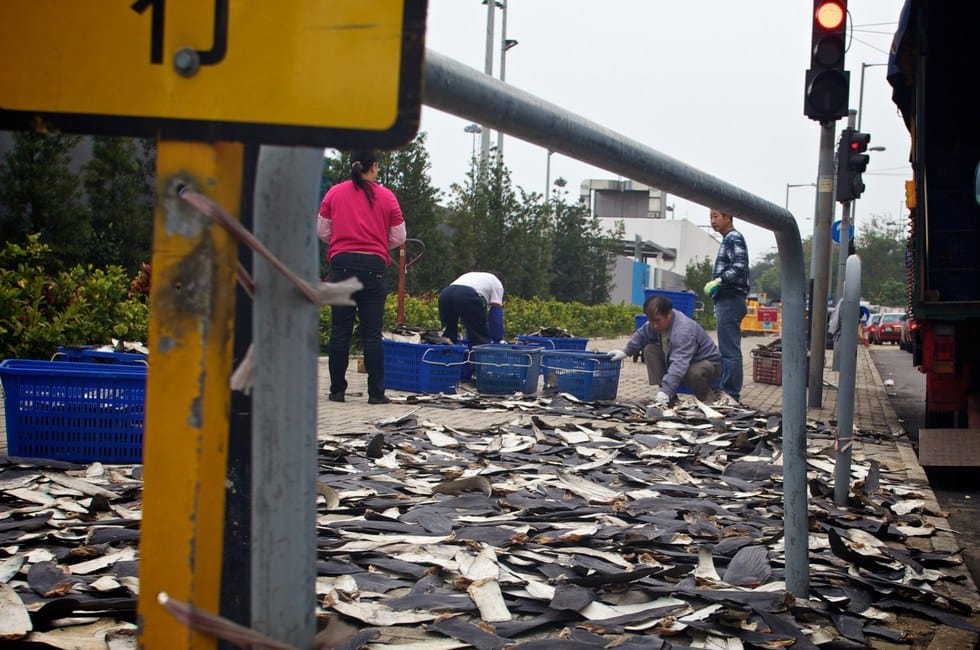 在香港街道上等待乾燥的鯊魚鰭。 取自The Dodo