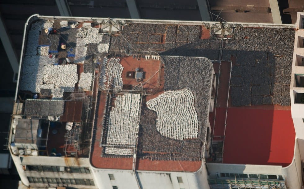 在香港一棟大樓屋頂上等待乾燥的鯊魚鰭。 取自The Dodo