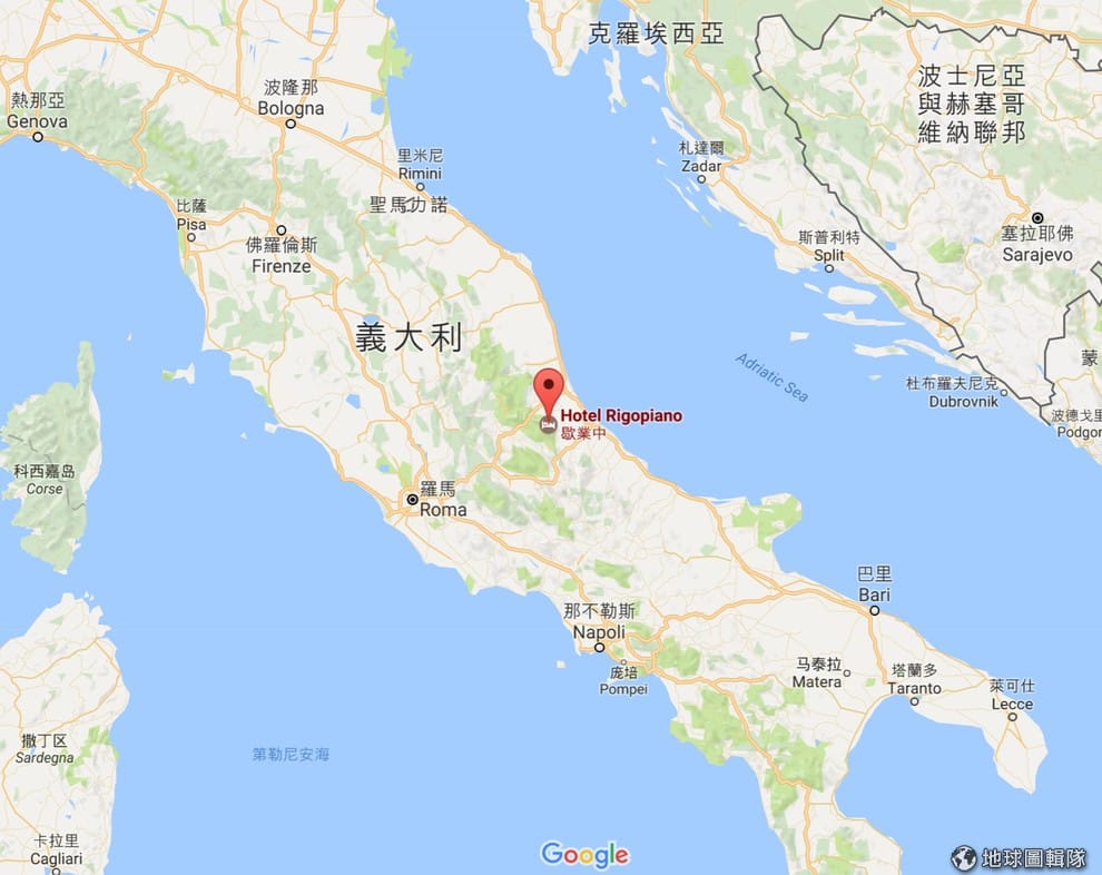紅色標記處即為發生地震的度假村rigopiano,該地區位在義大利中部。