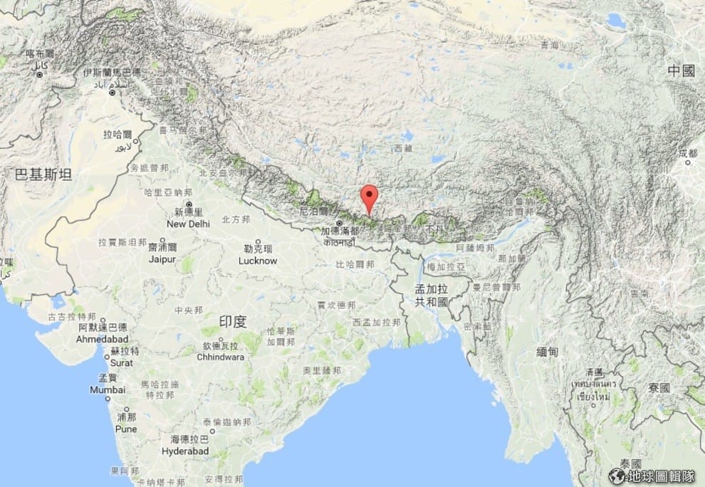 圖中紅色地標處即為位於喜瑪拉雅山脈的聖母峰,這座高峰是由印度板塊向北移動,並與歐亞大陸板塊碰撞而形成。