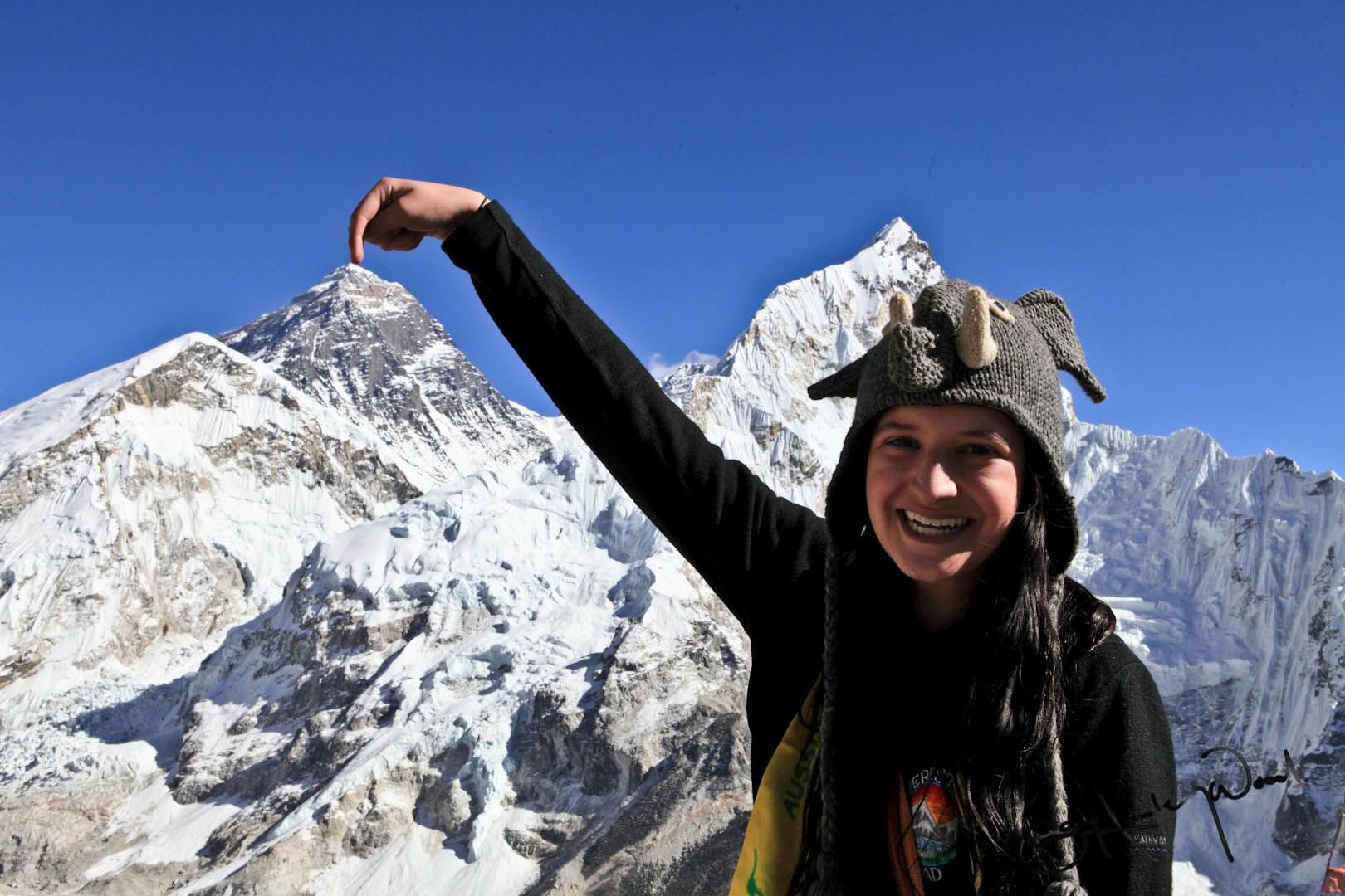 一名登山客用手比出聖母峰的位置。科學家懷疑兩年前的尼泊爾大地震讓聖母峰變矮了,現在,印度要派出探勘隊前往聖母峰一探究竟。