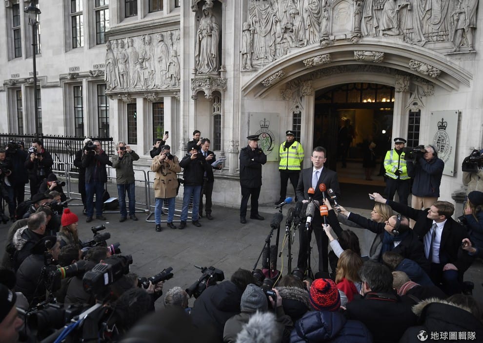 圖為英國政府律師長萊特(Jeremy Wright)在判決宣布後,於最高法院外接受記者採訪的畫面。