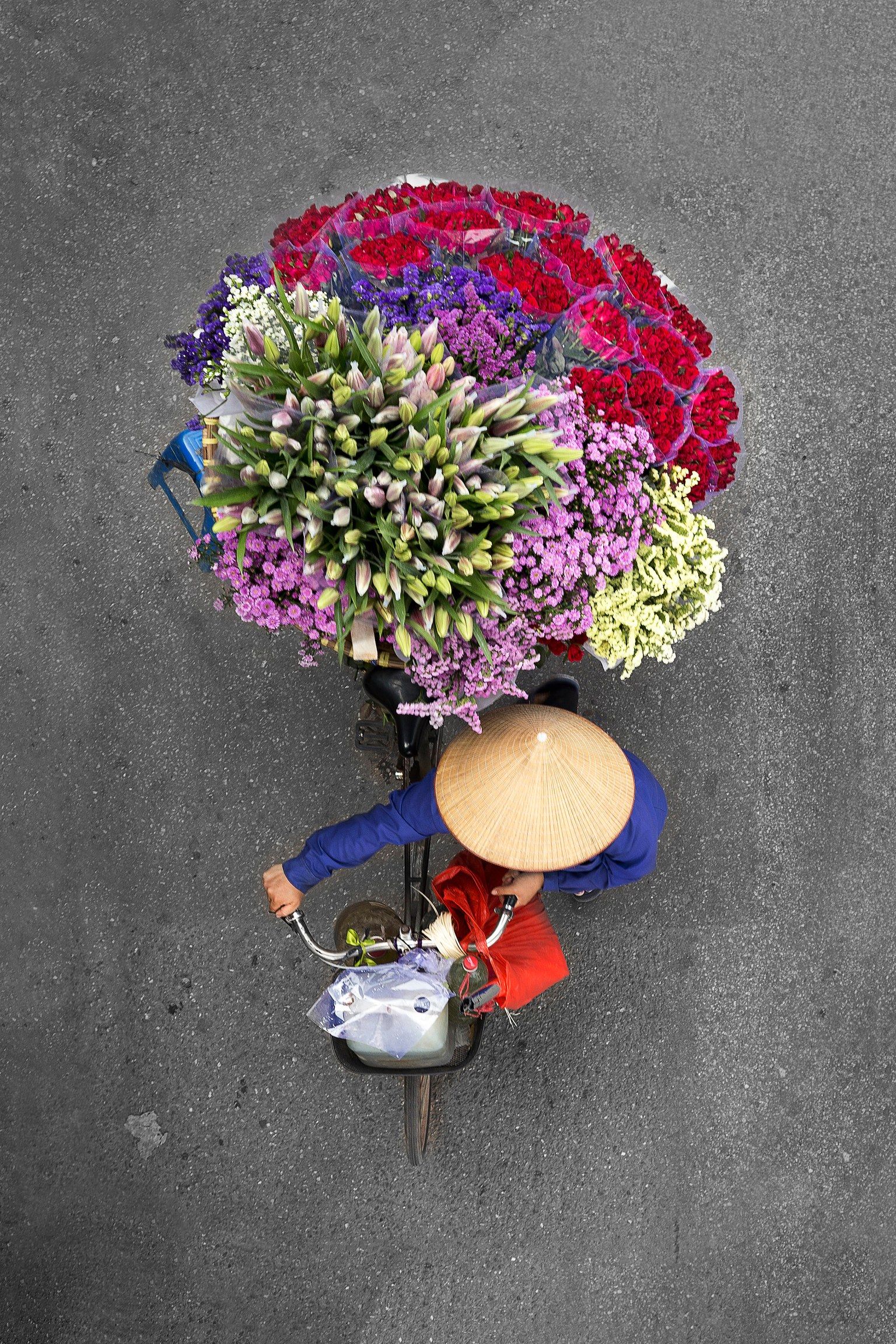 網友Loes Heerink嬌豔欲滴的鮮花前後包夾小販的單車,在移動的瞬間就像一朵巨大的五彩鮮花,奪人心神。