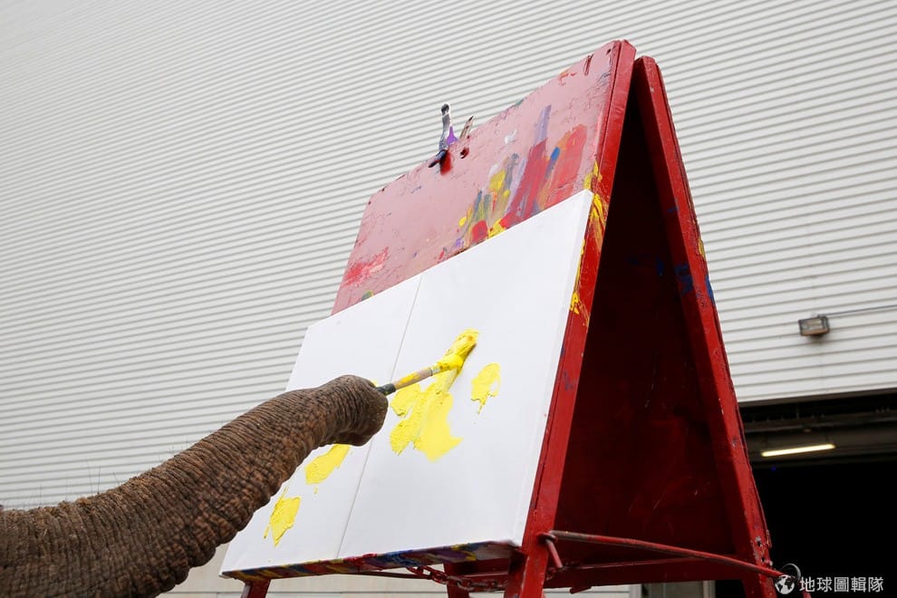 一隻大象正在用象鼻畫畫,由於馬戲團的動物表演會要求動物做出許多違反牠們本性的舉動,因此一直備受爭議。