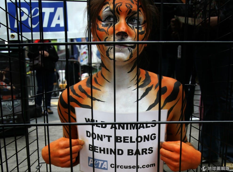 善待動物組織(PETA)畫上老虎的花紋,把自己關在籠子內抗議玲玲馬戲團把動物當作娛樂項目的手段,她手上的標語寫著:野生動物不該被關在牢籠裡頭。