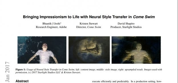 路透社這位《暮光之城》系列的女主角最近初次擔綱導演之職,導了《Come Swim》這部短片,並在這部影片中使用一種被稱為「風格轉移」(style transfer,把一個圖像或影片的美學風格應用到另外一個)的機器學習技術,來創造印象派的視覺風格。她與特效工程師 Bhautik J Joshi、製作人 David Shapiro 共同撰寫了這篇論文,說明在這部影片裡面所使用的手法,並在線上論文預印本資料庫網站 arXiv 上發表(論文進行同儕審查之前上傳的地方)。