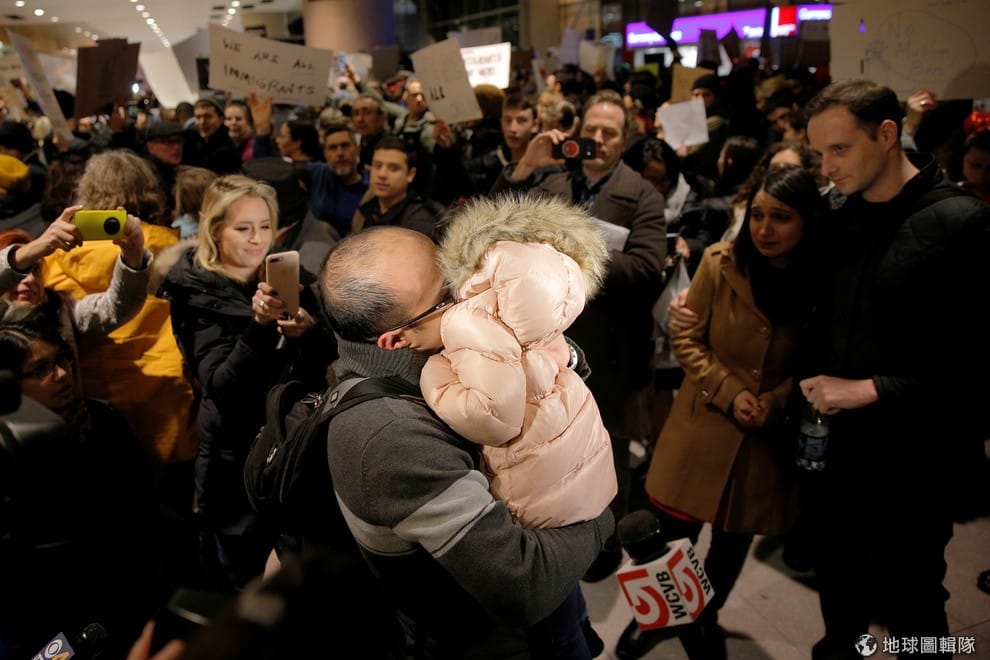 在抗議人潮的簇擁下,貝伊(Bay)一家在 29號重聚並離開機場。抱著女兒的貝伊(Hamed Bay)前陣子回到伊朗探望生病的父親,結果因為「旅行禁令」的影響,在返回美國時便遭到拘留訊問。
