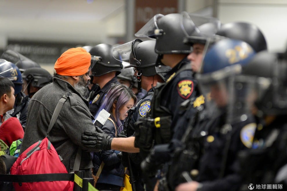 在美國海關暨邊境保護局(U.S. Customs and Border Protection, CBP)前,警方站在櫃臺前方維持秩序。