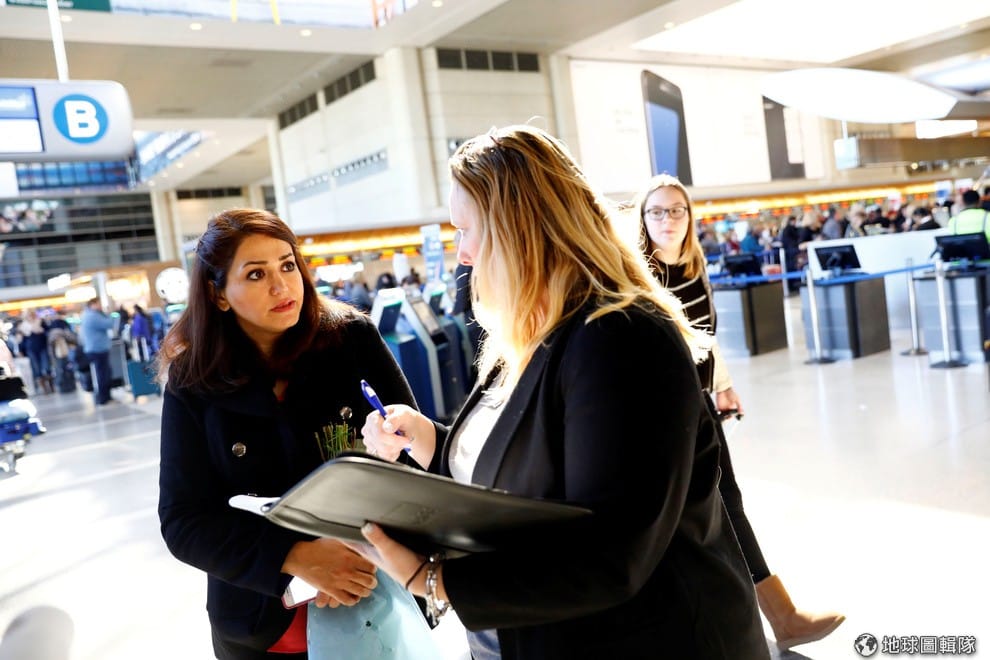 紗伊迪恩(Sarah Saedian,左)在機場和律師溝通著,商討要如何幫助受到禁令影響的伊朗親戚。