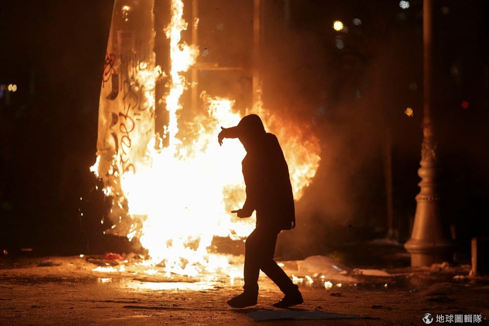 在抗議行動中民眾在鎮暴警察發生衝突,大街上也因為混戰燃起熊熊烈火。