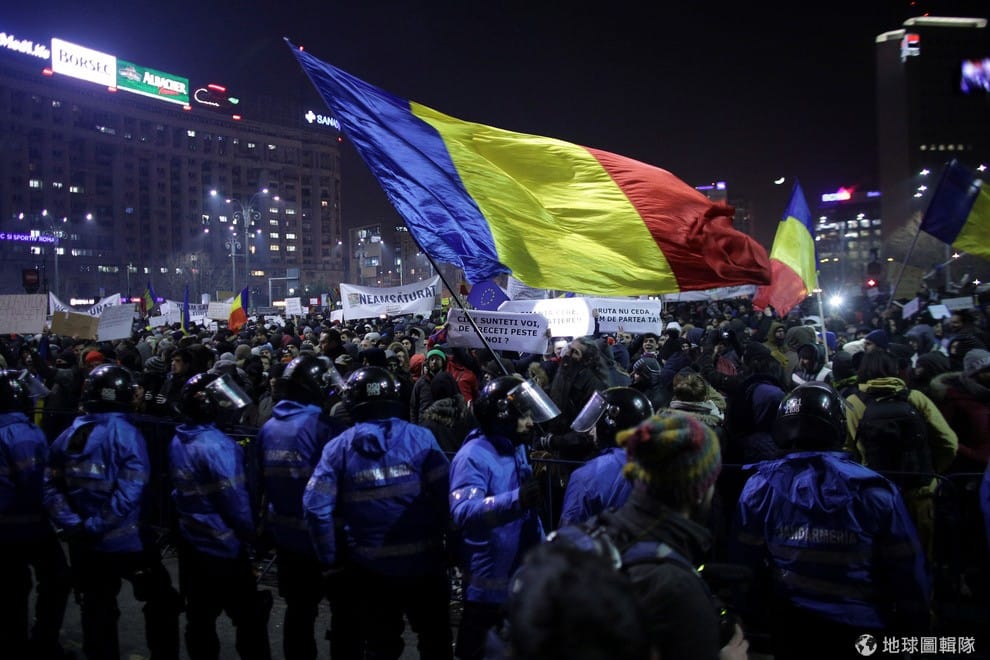地球圖輯隊深夜,成千上萬抗議新法的民眾齊聚首都布加勒斯特,他們揮舞著藍、黃、紅三色的羅馬尼亞國旗和鎮暴警察對峙。