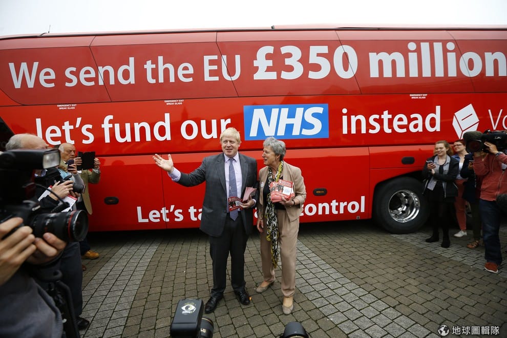 圖為前倫敦市長強生(Boris Johnson)與脫歐巴士的合照,在去年的脫歐公投時,強生不斷強調英國每周要給歐盟 3億5,000萬英鎊(折台幣約 136億元),認為這些錢應該轉為英國健保的基金。