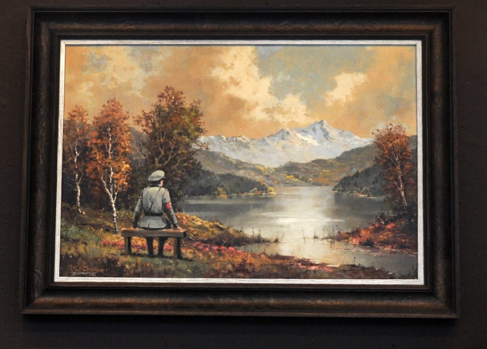 圖為英國塗鴉畫家班克斯(Banksy)的作品《平凡的邪惡的平庸性》(The Banality of the Banality of Evil),用來與德國政治理論家漢娜鄂蘭(Hannah Arendt)提出的理論《平凡的邪惡》相照應。漢娜鄂蘭指出,邪惡並不一定是像希特勒那樣瘋狂,當一般人被動地執行上層交代的工作而不多加思考時,也是一種邪惡的展現,也就是這種「不思考的邪惡」堆積出大屠殺的悲劇。各界對班克斯的畫作要展現的意涵有多方討論,卻一直沒有定論。