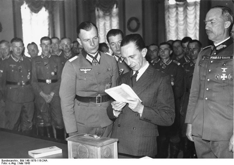 圖片右二即為戈培爾,他在納粹德國時期擔任宣傳部部長,被稱為「宣傳的天才」。談及自己的前上司,彭姆希爾說戈培爾是個長的很好看的男人,不過有點矮,她提到戈培爾總是把自己打理的很好、很注重儀表,但有點傲慢。