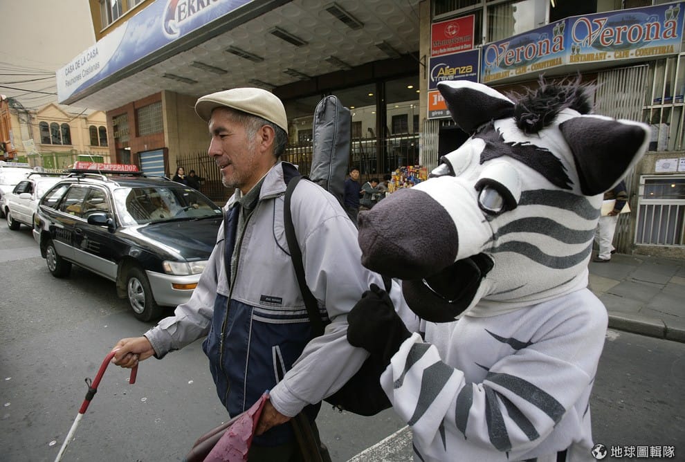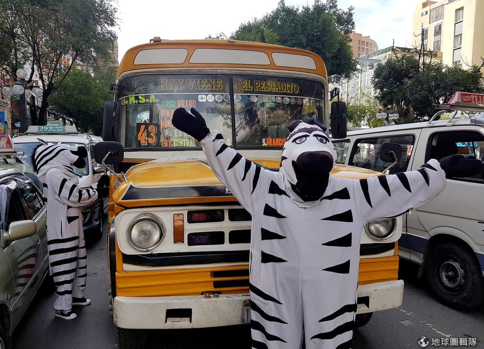 每當尖峰時刻,玻利維亞拉巴斯城的大街上都會出現斑馬人,他們穿梭在車陣中一邊宣導交安,一邊帶給大家歡樂。