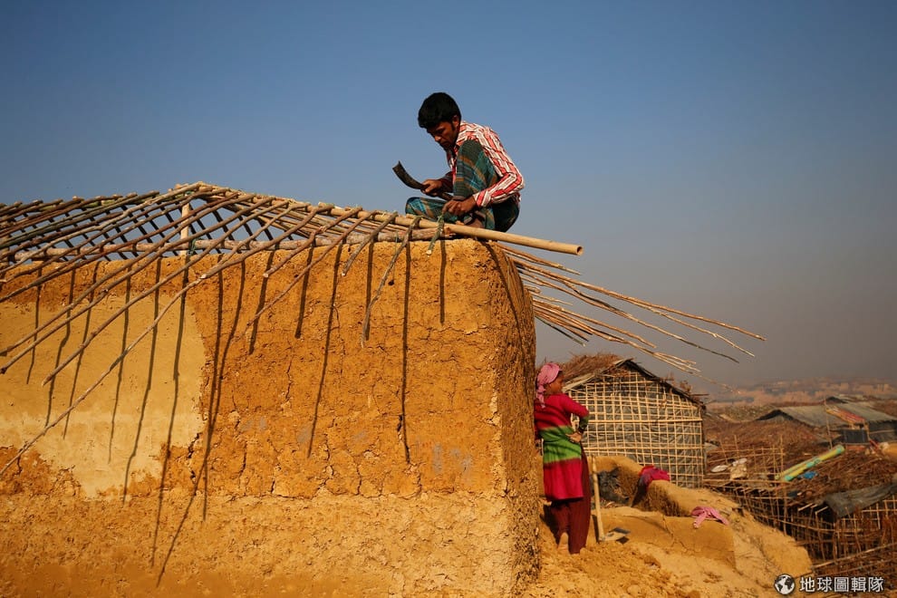 新來到孟加拉的洛興雅難民正在修繕他們的房子。根據目擊者證詞,17-45歲的男性與處在生育年紀的女性,都有被軍隊綑綁帶走的情況。