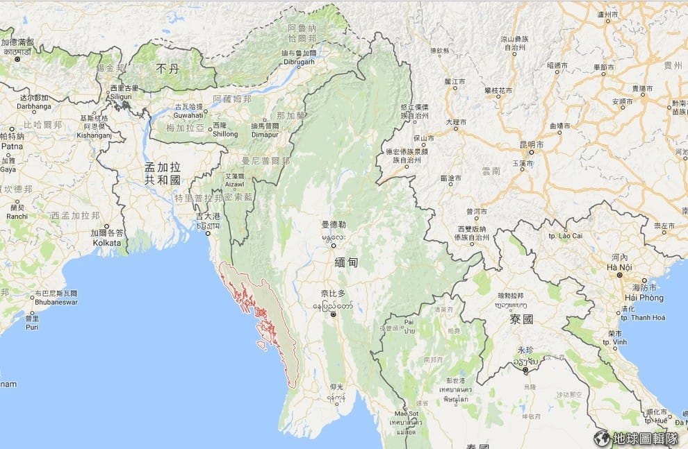 圖中紅色區塊即為緬甸洛興雅人群居的若開邦,當地信奉佛教的若開邦人時常與信奉伊斯蘭教的洛興雅人發生衝突。
