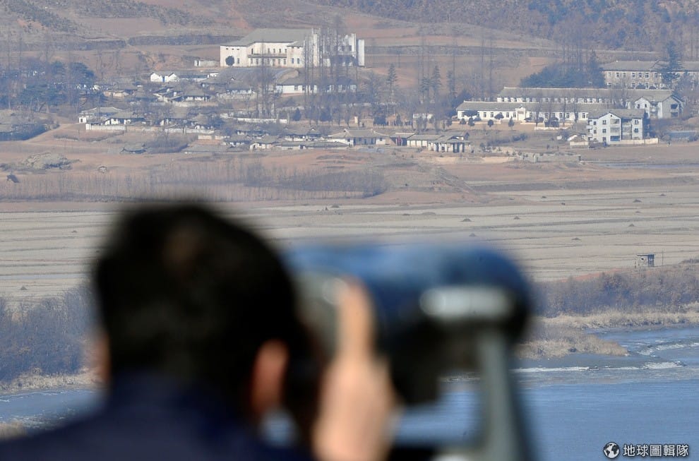 在南韓,一名男子用望遠鏡觀看北韓的邊境城市Kaepoong。