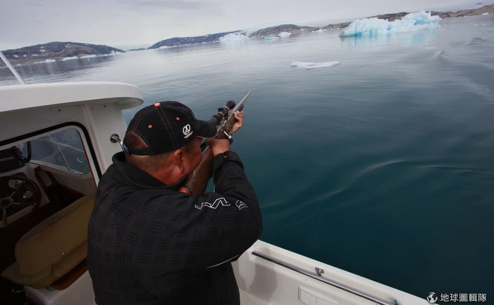 一名海豹獵人瞄準了遠處的海豹準備開槍。隨著氣候變遷導致海冰減少,獵人們能找到海豹的機會也大幅縮減。