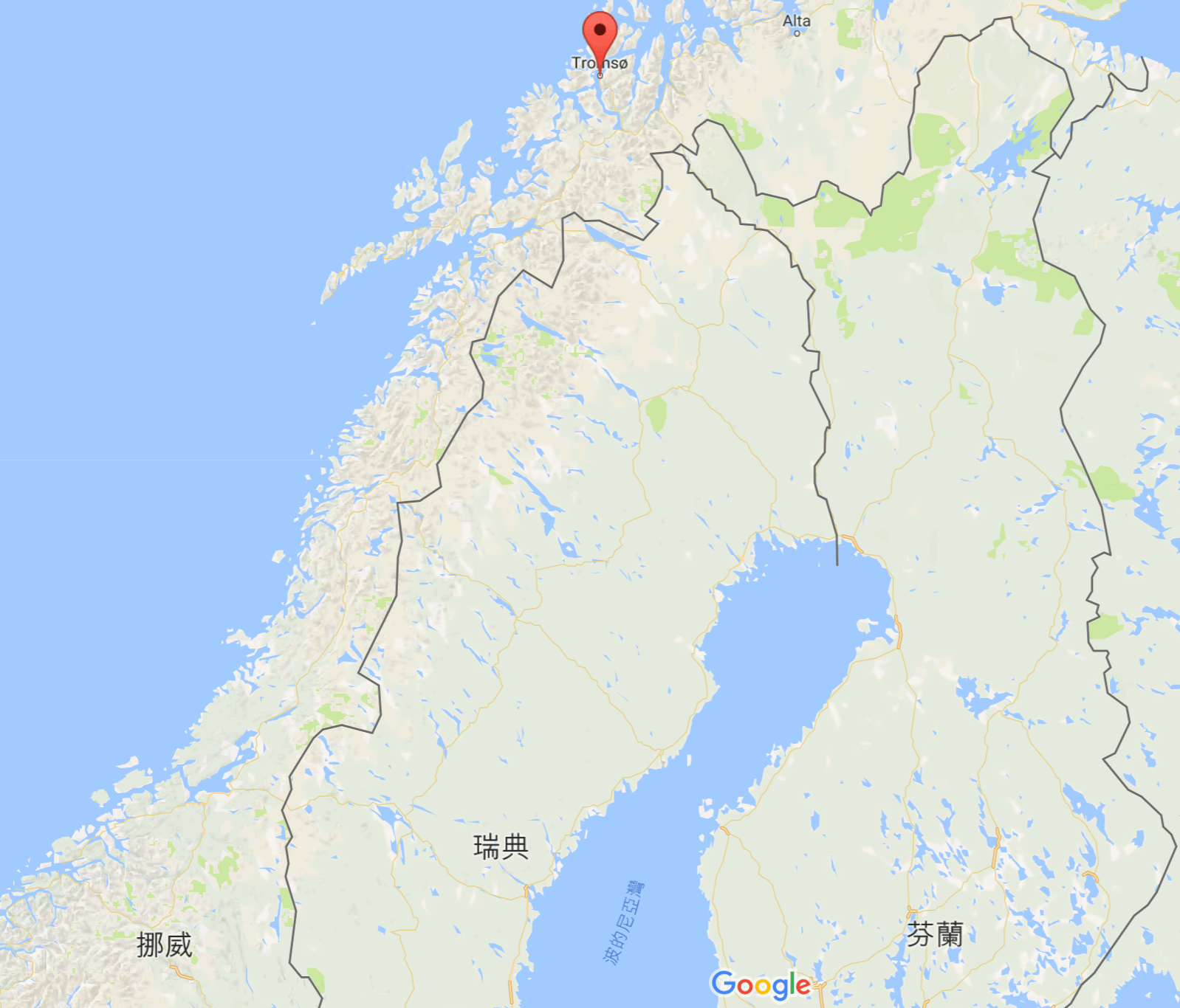 圖中紅標處即為挪威北方城市特羅姆瑟,這裡其實是座小島。