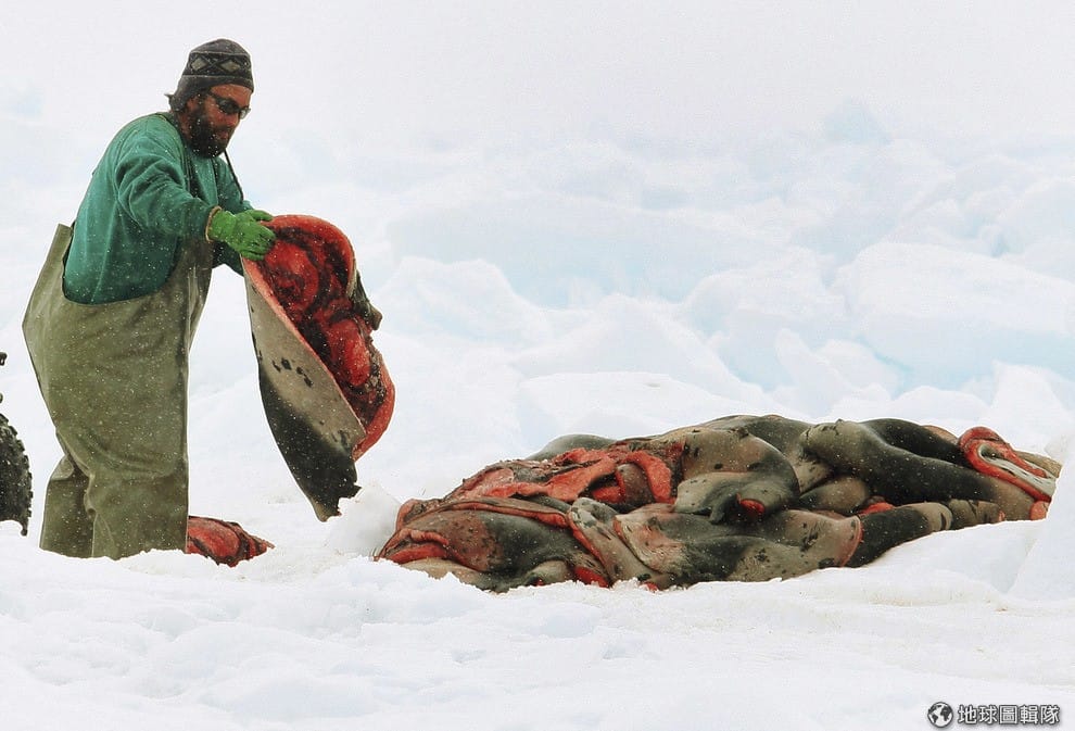 繼續閱讀一名海豹獵人正忙著把剝好的海豹皮堆到一旁,過去人們相信海豹皮格外保暖,所以對海豹製品情有獨鍾。